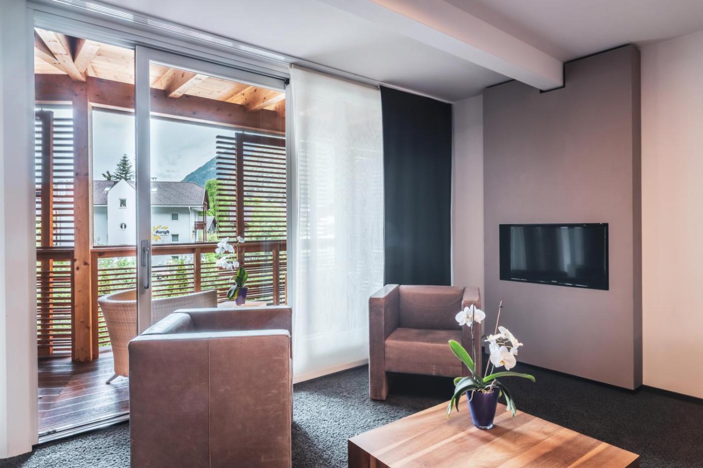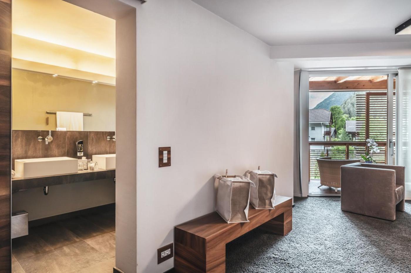 Junior Suite. Suite composta da 1 soggiorno, 1 camera da letto separata e 2 bagni con vasca edi cortesia. Potrete preparare i pasti e conservare gli alimenti nella cucina, che è provvista di utensili e frigorifero. In questo alloggio insonorizzato con pavimento in legno e vista sulle montagne troverete anche un’area salotto con TV a schermo piatto e un minibar. L’unità offre 2 letti. ;