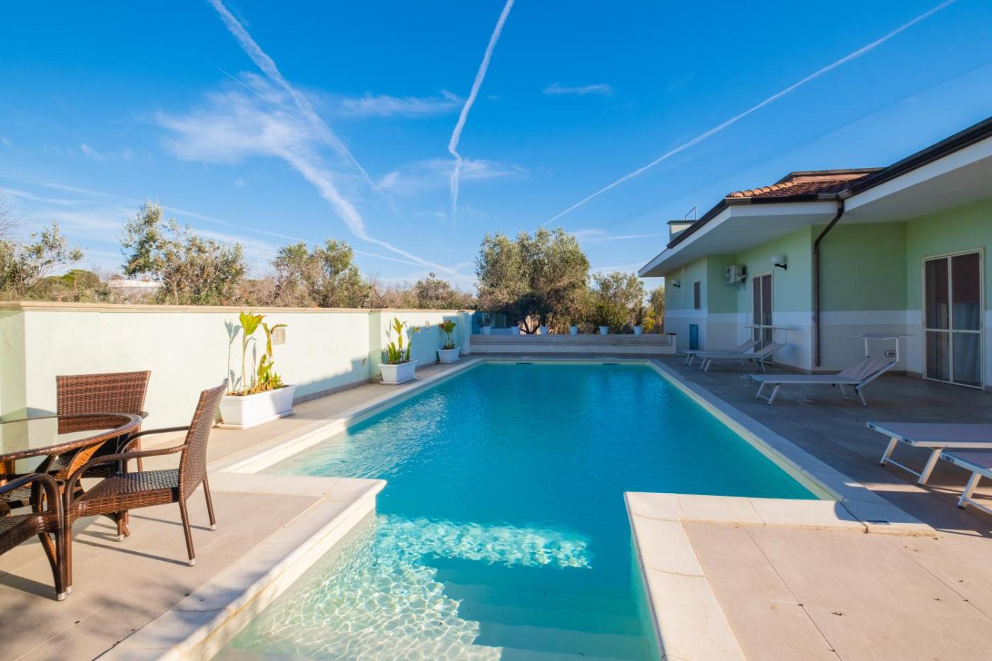 Villa con Piscina Privata. This villa offers a private pool. Featuring a private entrance, this air-conditioned villa comprises 1 living room, 5 separate bedrooms and 2 bathrooms with a shower and a bidet. Guests will find a stovetop, a refrigerator, kitchenware and an oven in the fully equipped kitchen. The villa also provides guests with a barbecue. Boasting a terrace with garden views, this villa also provides a washing machine and a flat-screen TV. The unit offers 8 beds.