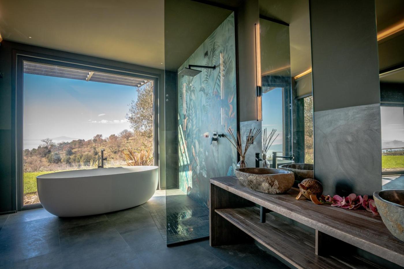 Villa con Piscina Privata. The pool with a view and fireplace are the special features of this villa. Featuring a private entrance, this air-conditioned villa consists of 1 living room, 3 separate bedrooms and 4 bathrooms with a walk-in shower and a bath. Guests will find a stovetop, a refrigerator, a dishwasher and kitchenware in the kitchen. The villa also offers a barbecue. The spacious villa provides a washing machine, soundproof walls, a tea and coffee maker, a flat-screen TV with streaming services, as well as lake views. The unit offers 3 beds.