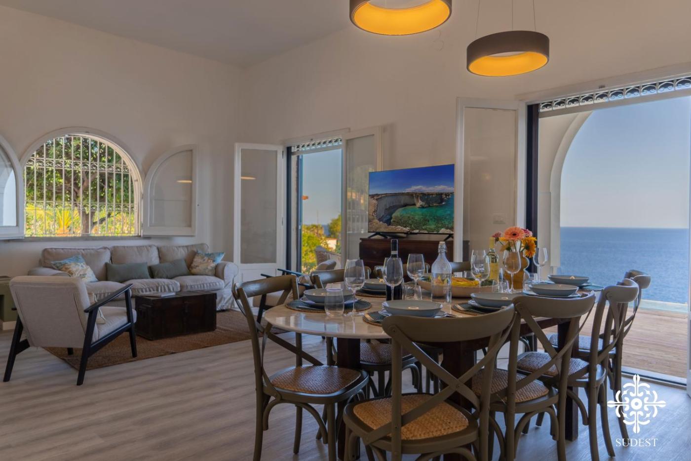 Questa villa prevede 5 camere da letto, 3 bagni, lenzuola, asciugamani, una TV a schermo piatto, una zona pranzo, una cucina con utensili e una terrazza con vista sul mare.