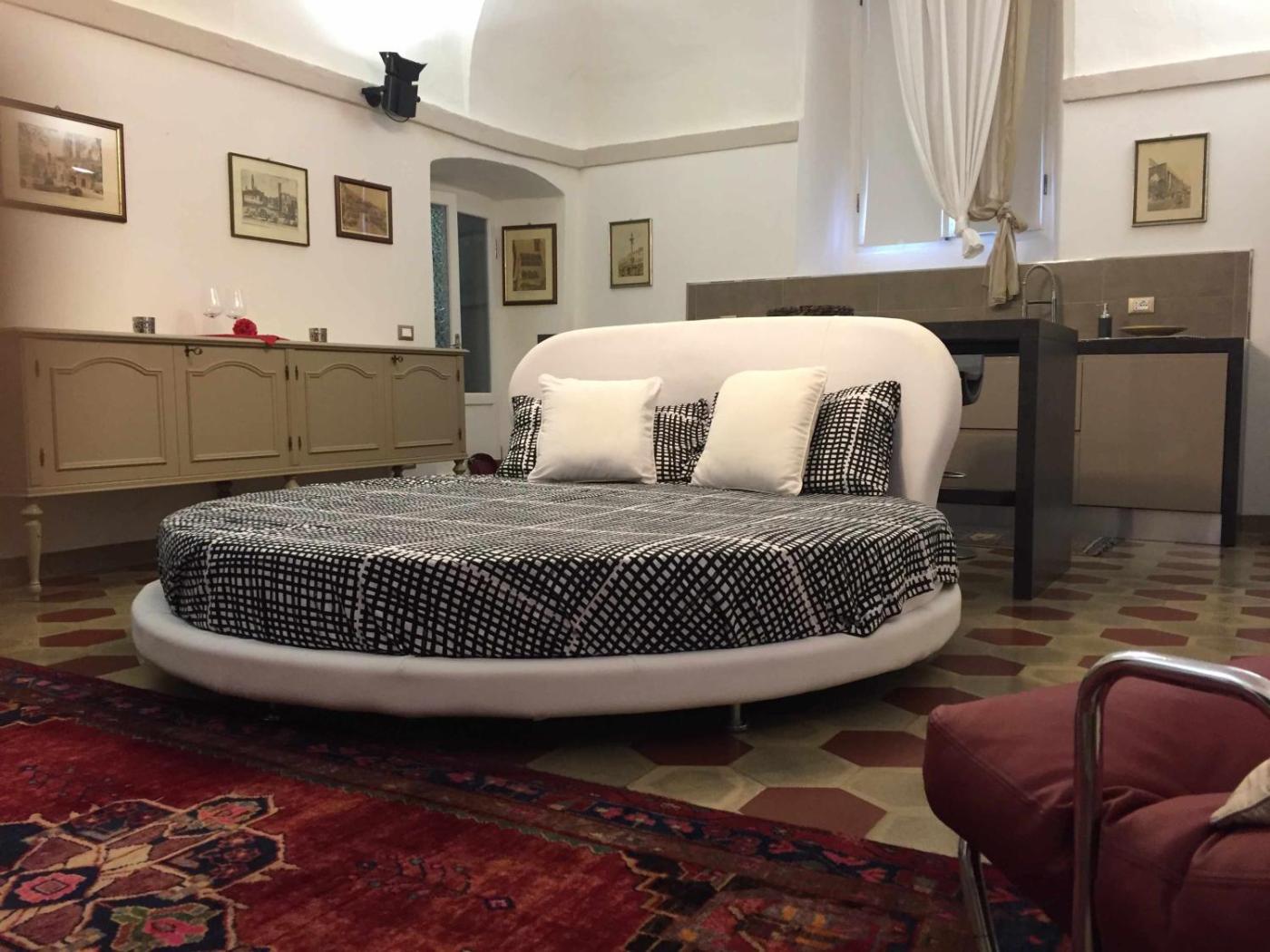 Appartamento Deluxe. This apartment features a kitchenware, dishwasher and electric kettle. The room has a round bed.